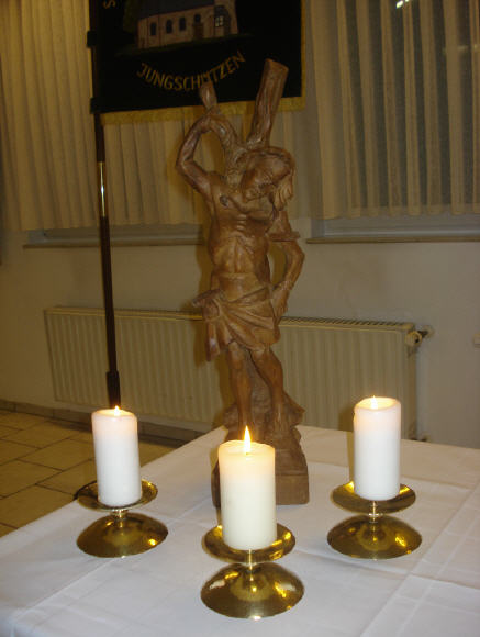 Im Schützenhaus wurde vom Dechant Fred Schmitz eine sehr schöne Andacht zelebriert. Clemens Brähler trug die Fürbitte vor. Nach dem gemeinsamen Abendessen gab es für zwei Schützen eine Überraschung. Bezirksbundesmeister Manfred Bittner ehrte Willi Käufer mit dem Hohen Bruderschaftsorden und Heinz Steinborn mit dem Sankt-Sebastianus-Ehrenkreuz für ihre Verdienste in der Bruderschaft. Ebenso wurden die Vereinsmeister der verschiedenen Klassen des vergangenen Jahres geehrt. Vereinsmeister wurden: Kornelia Schaufler, Anneliese Käufer, Swantje Peters, Herrmann-Josef Mörs, Hans Schaufler, Heinz Steinborn und Oliver Pütz. Die Sankt-Sebastianus-Pokale erhielten Angelika Mörs und Joachim Kozak. Die Glückspokale gingen an Silvia Danz und Hans Schaufler. Die besten Jahresteiler schossen Kornelia Schaufler und Gerhard Oberste. Beim Brezelschießen belegten Jan Peters, Felix Danz, Marlies Bonn, Brigitte Schäfer und Joachim Kozak jeweils Platz 1. Den Riesenbrezel konnte Dieter Schäfer mit nach Hause nehmen. Das gemütliche Beisammensein klang spät am Abend aus.